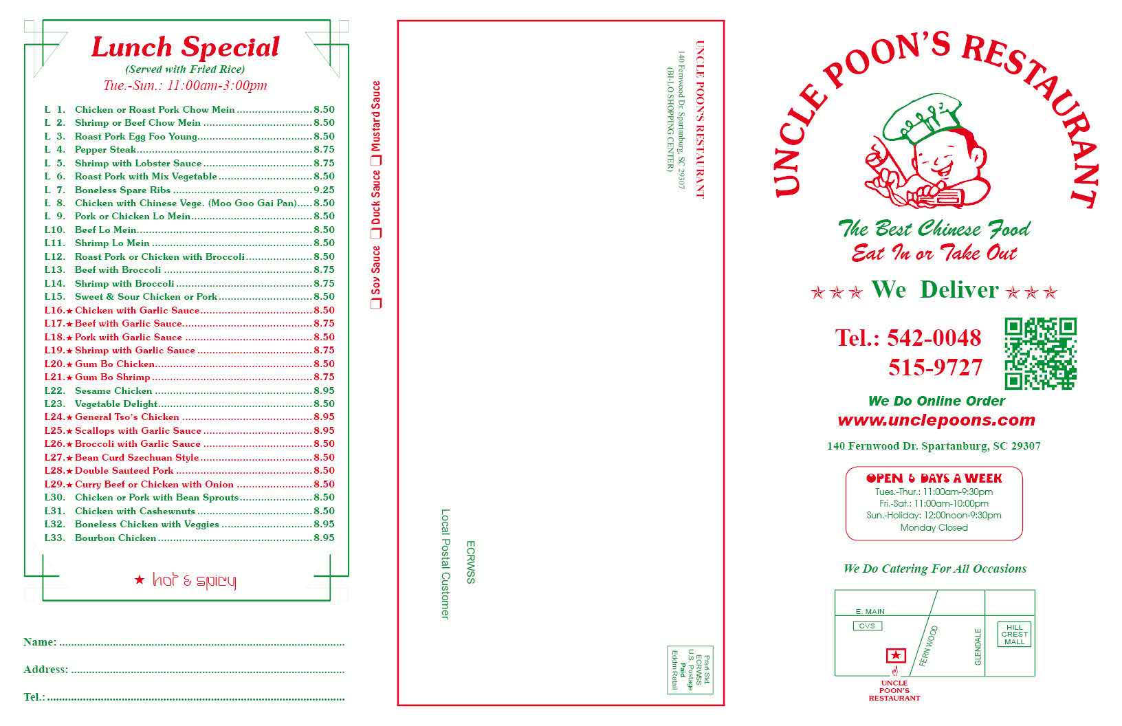 - “We Do Online Order www.unclepoons.com” in bold font (≈11pt), with the website URL underlined (a subtle design choice to indicate it’s a clickable link, even on a printed menu).