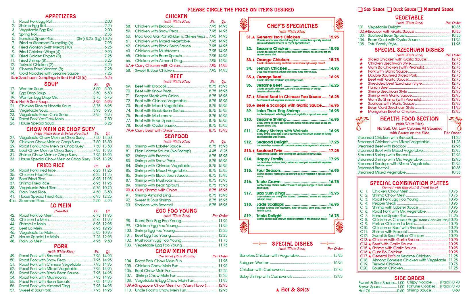 - Ordering Guidance: The “PLEASE CIRCLE THE PRICE ON ITEMS DESIRED” note reflects the menu’s takeout-friendly design, allowing diners to mark selections easily.